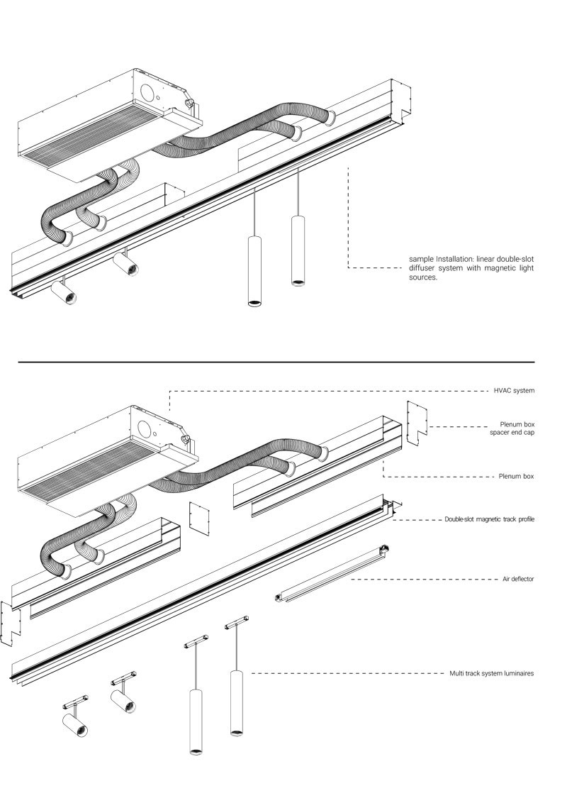 Air Multi Track System offers a solution for integrating the linear slot air diffusers with the Multi Track System. The system provides flexibility to choose from single, double, or triple slot profiles. By connecting these profiles to split duct or fan coil systems, you can freely adjust or move lighting sources and experience simultaneous lighting and air conditioning.