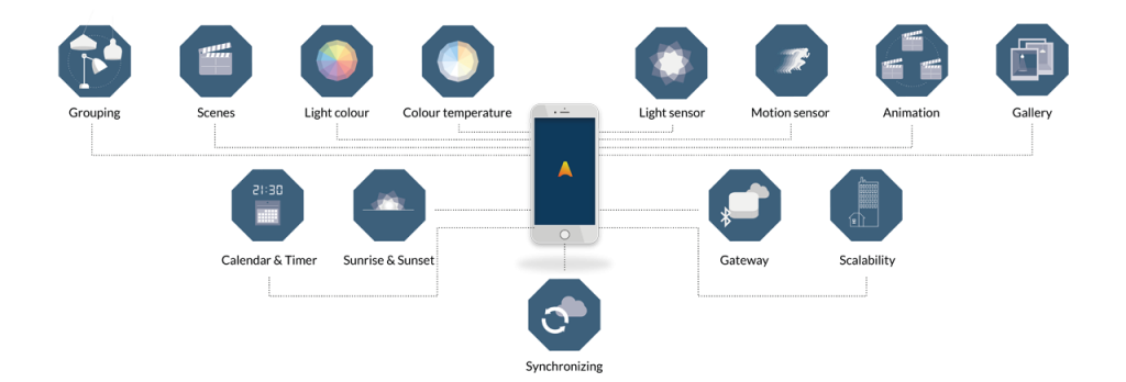 The wireless Bluetooth module allows to structure network nodes (up to 127 devices and sensors) connected in secure Wireless mode and to control the system through an intuitive App for smartphones and tablets (available for both Android and IOS). The programming, dimming and monitoring functions of the system are easily accessible by any user.