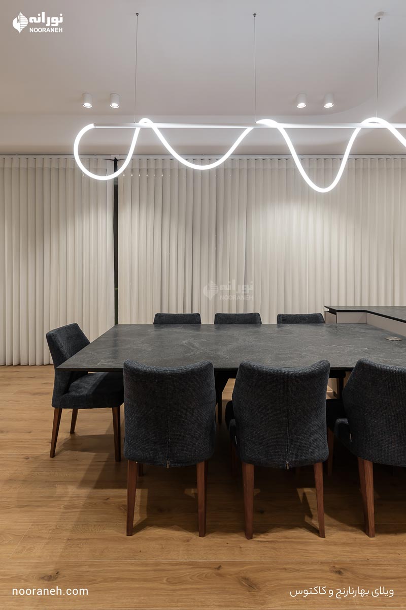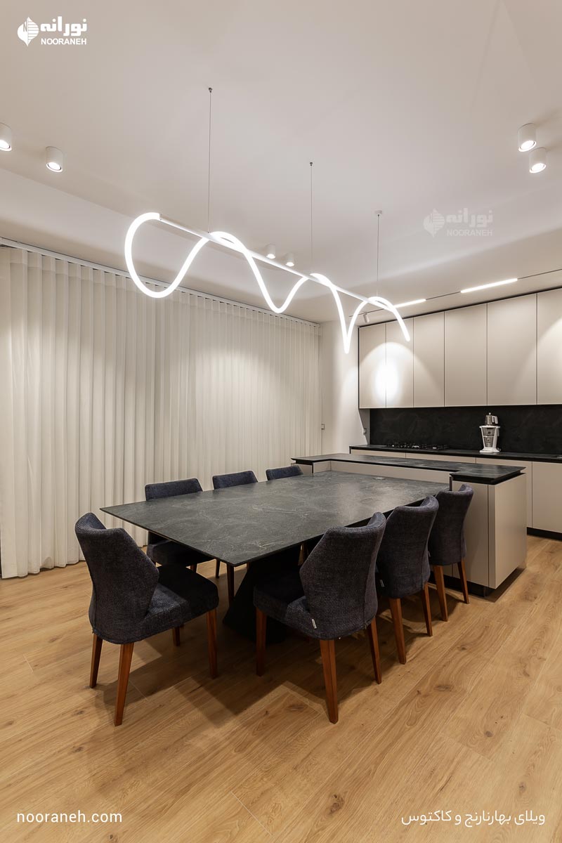In the kitchen, “Verona” and “Unique” magnetic lights provide general and accent lighting, while “Flex Tube” luminaires is used for decorative illumination above the dining table.