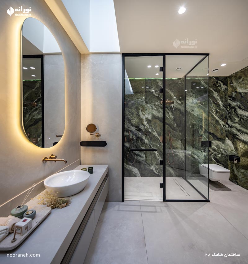 - In the kitchen, the integration of the “Multi Track” system with “Trimo” downlights provides both task lighting and general illumination, balancing functionality and aesthetics. “Trimo” downlights are also used in the bathroom to ensure clean, even lighting.